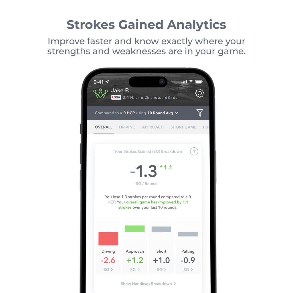- Strokes Gained Analytics: Pinpoint your strengths and weaknesses based on your target handicap, so you know exactly which part of your game to work on.