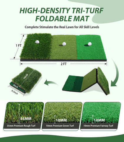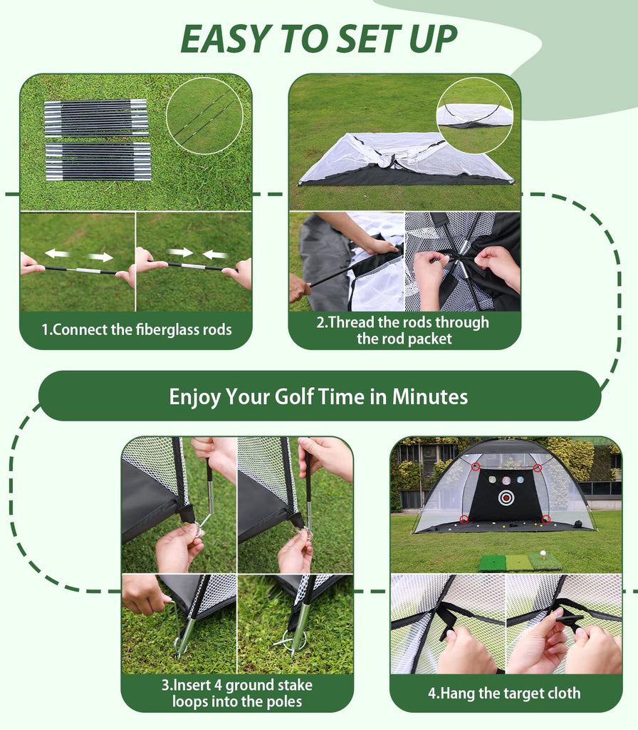 - 【Easy to Assemble & Portable】Our golf net comes with step-by-step instructions and the necessary components and can be easily set up and disassembled in 3-5 minutes. Whether you're indoors in the living room or garage, or outdoors in garden, you can set up the golf practice net and mat with ease, regardless of the weather or location. Additionally, the included tri-turf mat is foldable, allowing to pack all accessories into the equipped carry bag for effortless carrying and storage