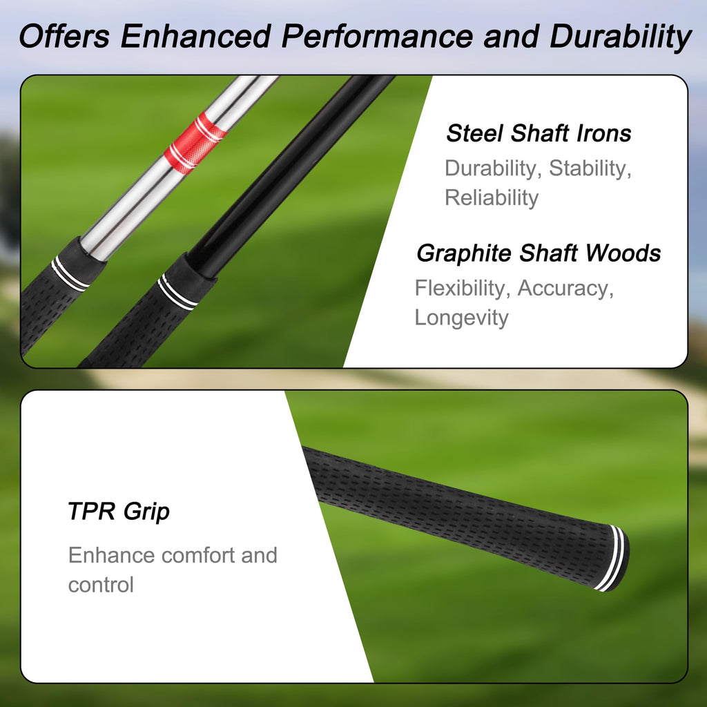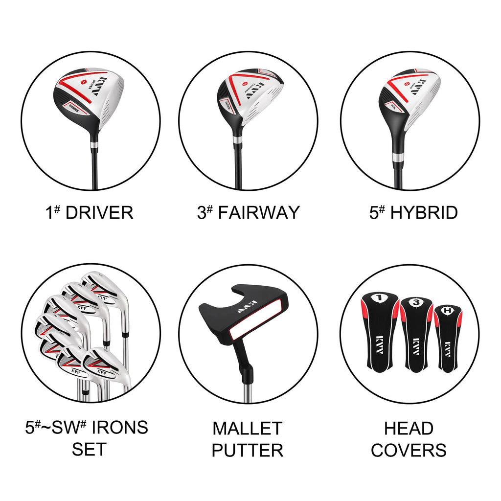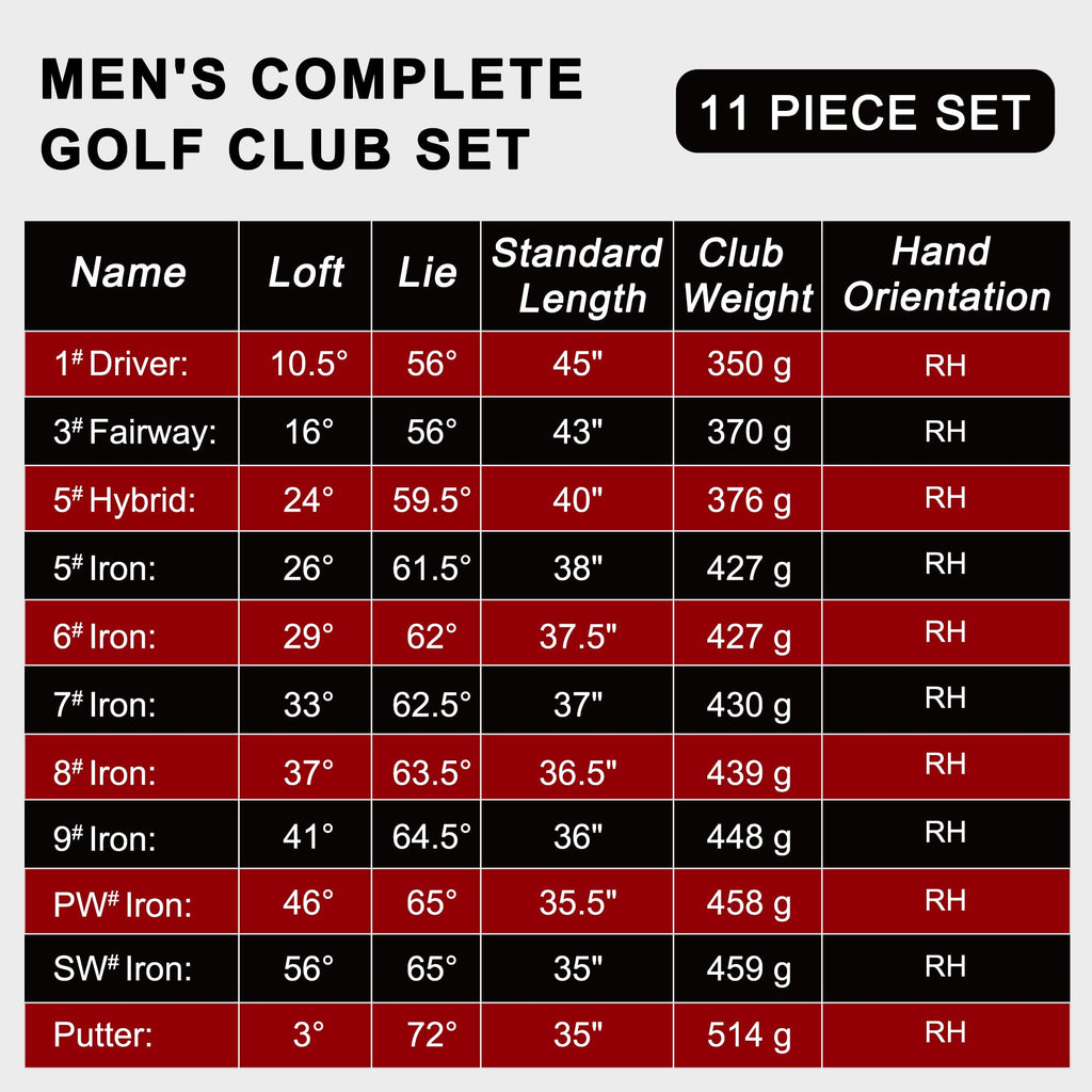 - Men's 11-Piece Complete Golf Clubs Set: The set comes with a 1# driver, a 3# fairway wood, a 5# hybrid, and irons ranging from 5# to P#, along with a putter. This awesome set is specially designed for right-handed male golfers and is an outstanding choice.