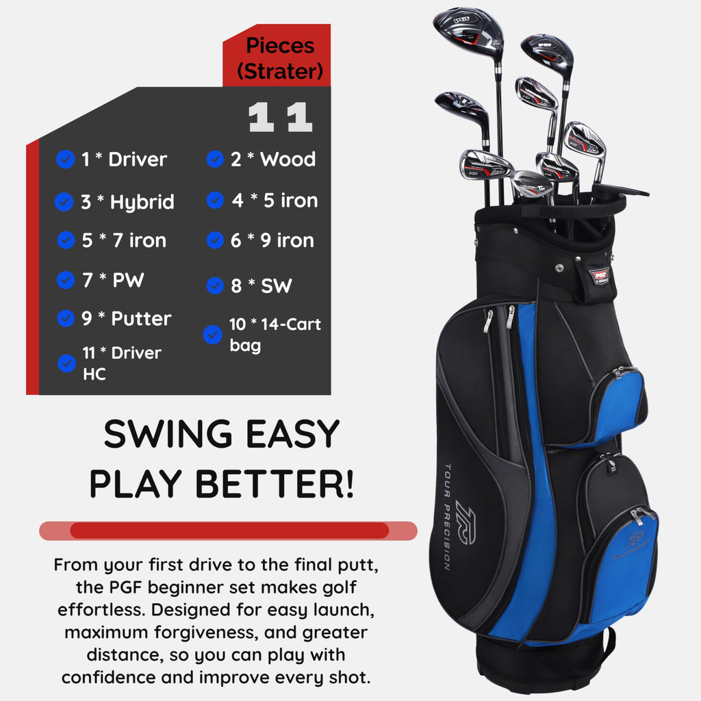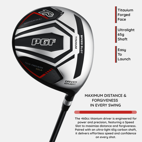 Details: Elevate your golf game with our premium PGF Men's Gold TP Complete Golf Club Package Set, meticulously designed for right-handed golfers with a standard length. This 11-piece set is engineered for forgiveness and distance, featuring a lightweight 460cc forged titanium driver with a large sweet spot and optimized Inertia Generator for longer, controlled drives. The oversized fairway wood ensures easy launch and maximized distance, while the versatile hybrids offer extreme playability from any lie. The irons, from 5 to SW, boast advanced perimeter weighting and a lower CG for high launch and forgiveness. The set includes a classic matte putter with an 'L' neck hosel for improved roll and alignment. Each club comes with a 1-year warranty, ensuring your satisfaction on the course. Weighing in at a total of 65 grams, this set is designed for comfort and control. Upgrade your golf experience with this comprehensive, high-performance set.