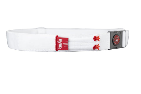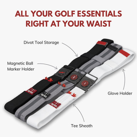 Elevate your golf game with our reversible golf utility belt designed to streamline your golf game. Our patent pending golf belt organizes your essential gear on the course ensuring that you're always ready with your ball marker, tees, divot tool, and glove at your fingertips. Say goodbye to fumbling around in your pockets or bag, The Byrd Belt keeps your essentials securely in place for quick and convenient access from tee to green. Make every swing count with the ultimate combination of style and functionality. Comes with The Byrd divot tool, 2 tees, and a ball marker FREE! Colors - Navy Blue - Grey Stripe - Black with Red Trim Reversible One side for golf with tee sheath, divot tool sheath, ball marker magnet, and glove holder Other side for every day Up to 44" waist
