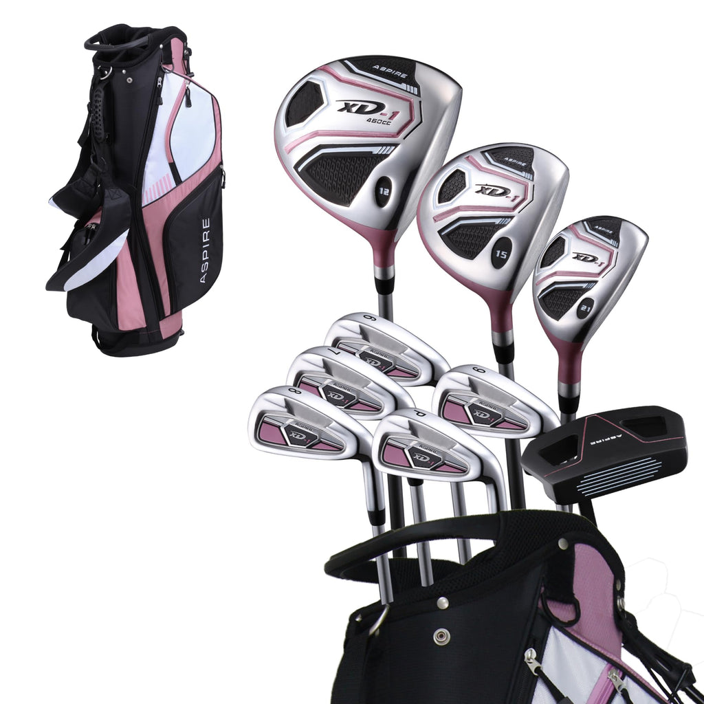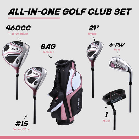 • All-In-One Womens Golf Set: This ladies golf clubs set has everything you need to play your best: A driver, fairway wood, hybrid, 6-PW irons, putter, stand bag, and 3 headcovers